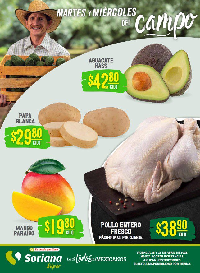 Hace un momento vi que Soriana Súper publicó su folleto Martes y Miércoles del Campo, que contiene sus ofertas válidas el martes 28 y miércoles 29 de abril de 2026 o hasta agotar existencias, entre las que encontrarás Precios especiales, sus ofertas son válidas en artículos seleccionados, aplican en sus sucursales físicas participantes y las siguientes son las que corresponden a Frutas, Verduras y Carnes.