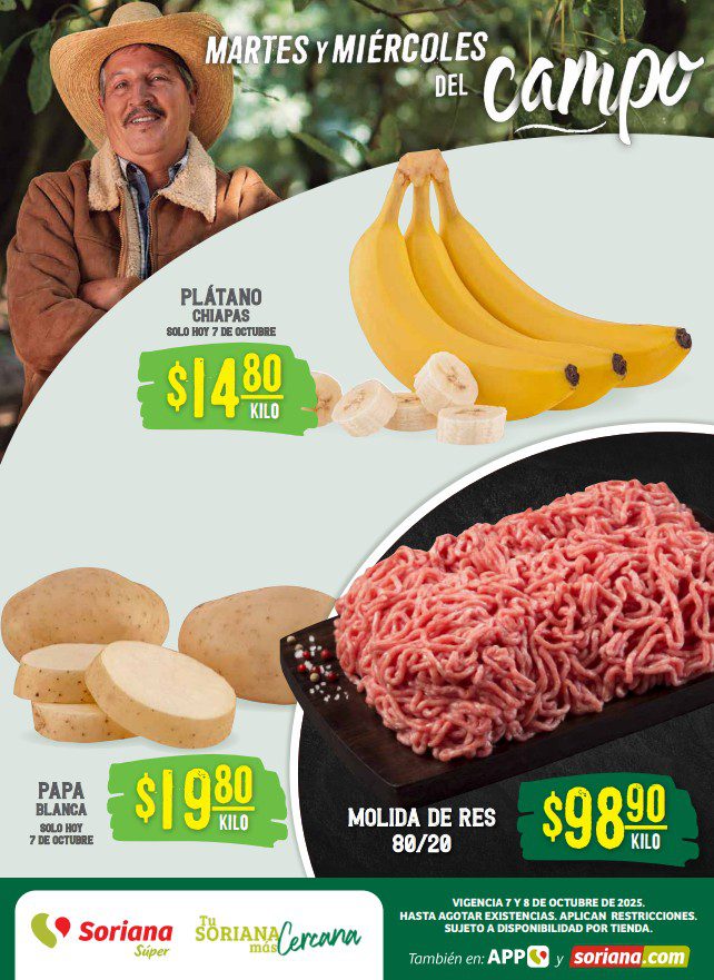 Hace un momento vi que Soriana Súper publicó su folleto Martes y Miércoles del Campo, que contiene sus ofertas válidas el martes 07 y miércoles 08 de octubre de 2025 o hasta agotar existencias, entre las que encontrarás hasta un 20% de descuento y Precios especiales, sus ofertas son válidas en artículos seleccionados, aplican en sus sucursales físicas participantes y las siguientes son las que corresponden a Frutas, Verduras y Carnes (al final te comparto el folleto completo):