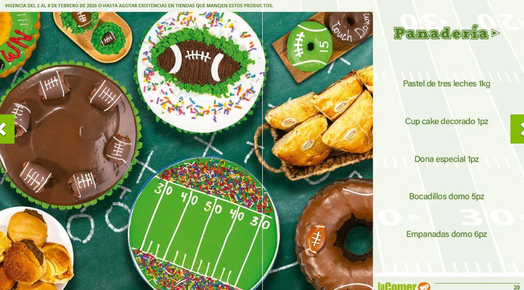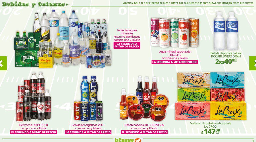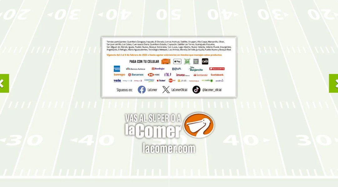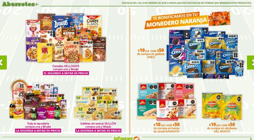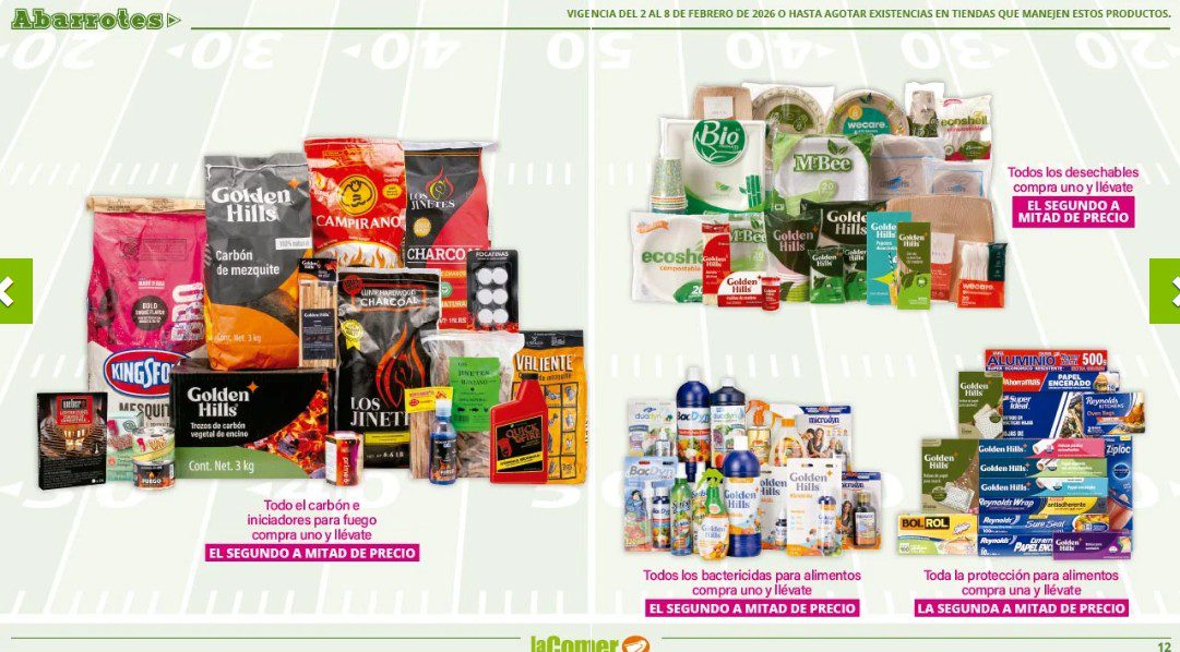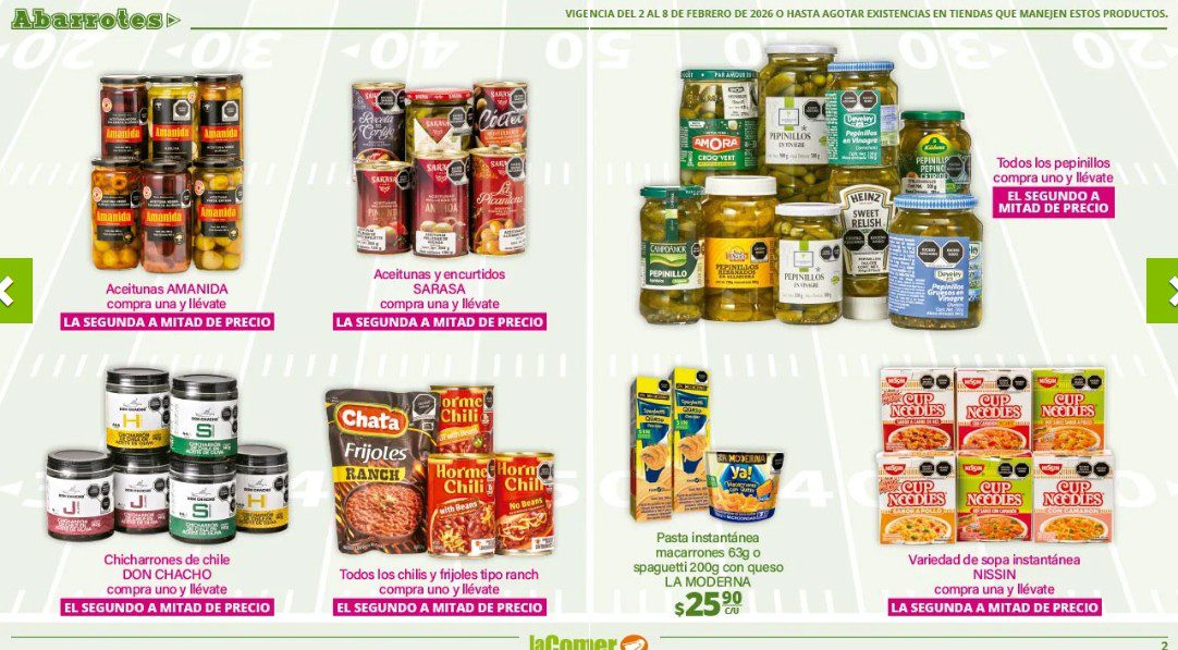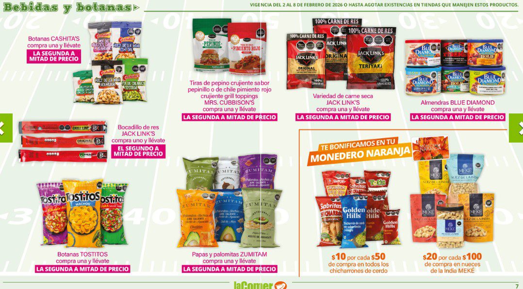 Ya salio el folleto por el Super Bowl de La Comer, que contiene sus ofertas válidas del 02 al 08 de febrero de 2026 o hasta agotar existencias y en el que encontrarás que, en la compra de 1 te llevas el Segundo a Mitad de precio, Ofertas especiales en la compra de importes determinados, Bonificaciones en tu Monedero Naranja en la compra de determinados importes, Descuentos especiales en compras por determinadas unidades, Precios especiales en productos seleccionados y Ofertas especiales en sus líneas de productos Golden Hills; las ofertas son válidas en su tienda en línea: www.lacomer.com.mx/ y en sus sucursales físicas y este es su folleto: