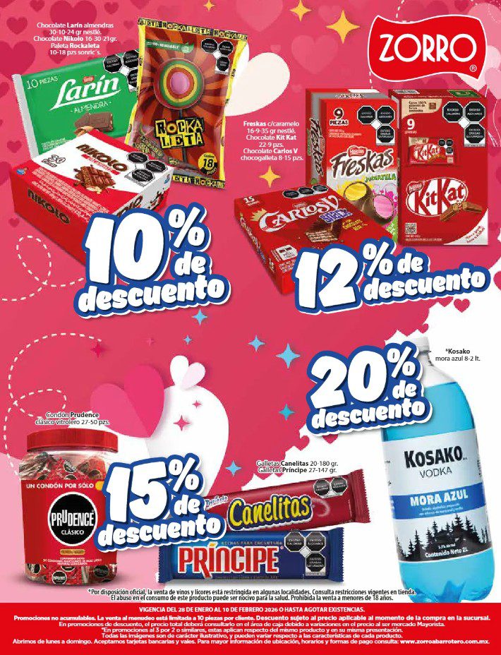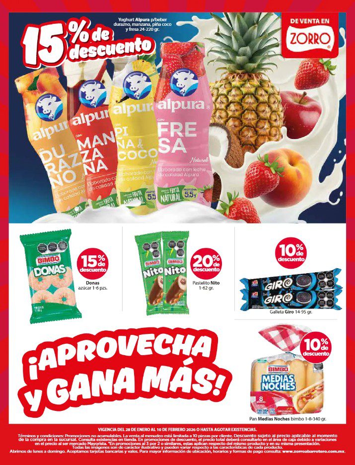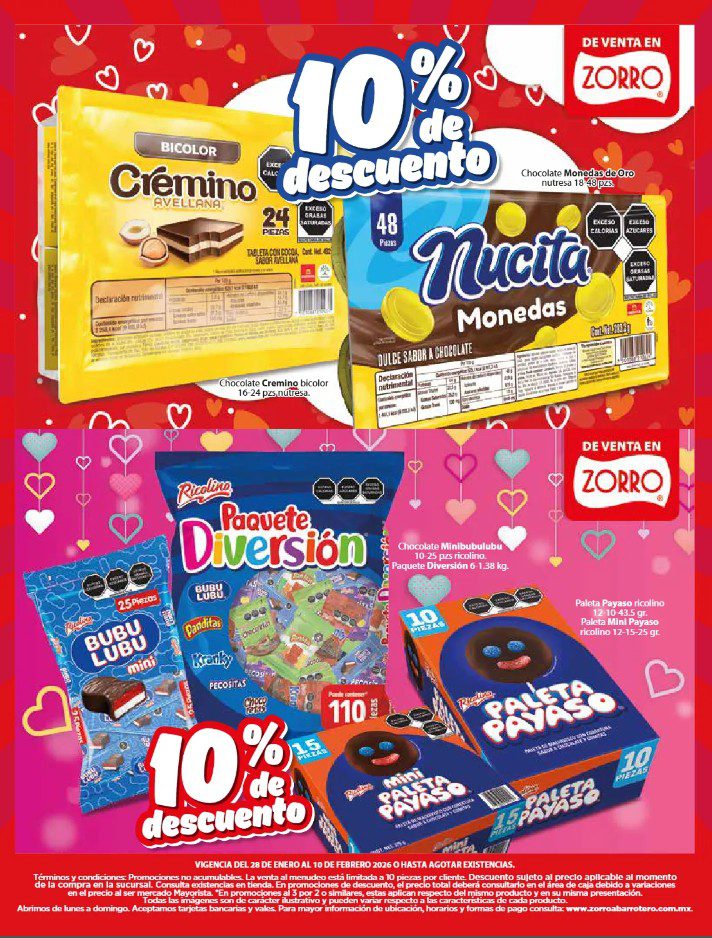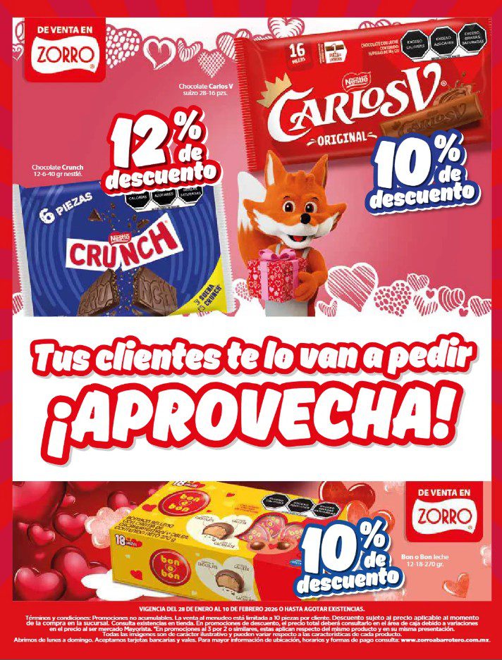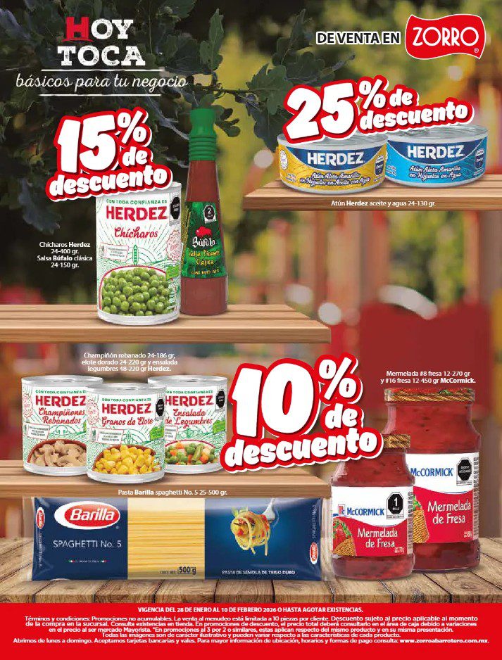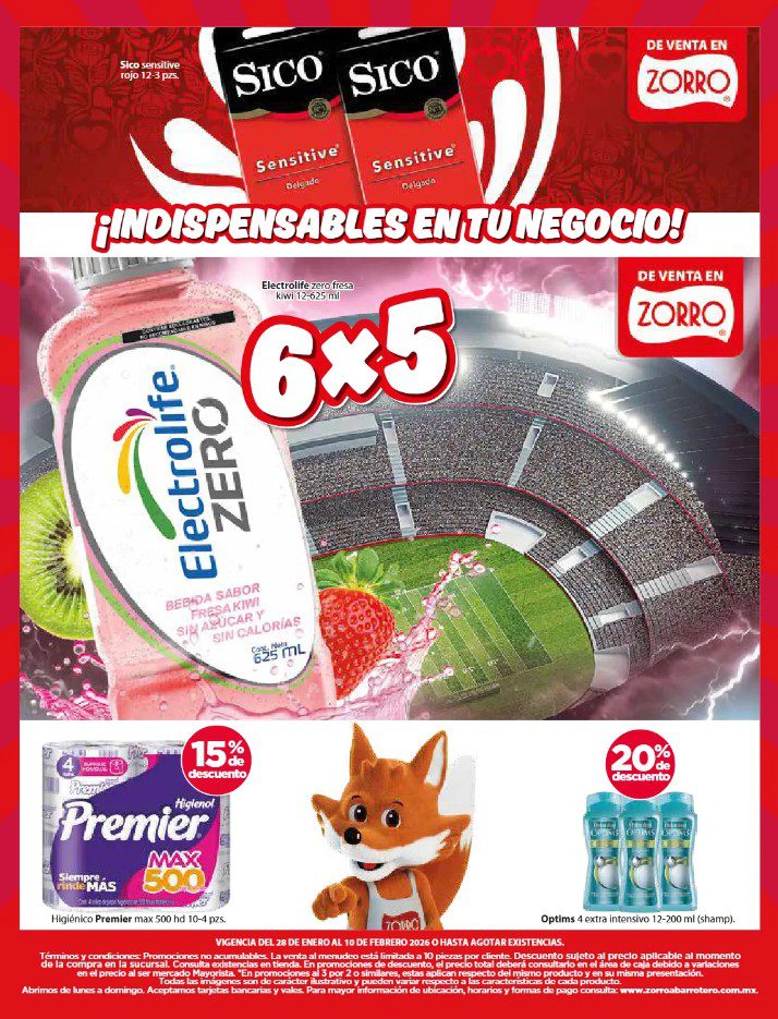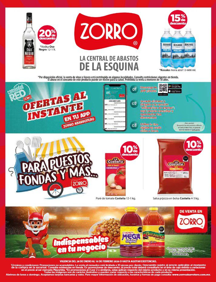 Apenas estoy viendo el folleto, que el Zorro Abarrotero publicó y que contiene sus ofertas que estarán disponibles del 28 de enero al 10 de febrero de 2026, entre las que se encuentran 4×2, 6×5, Marcas Exclusivas, Indispensables para tu Negocio, Producto Gratis en la compra de mercancía seleccionada, hasta un 33% de descuento y Precios especiales; las ofertas aplican en mercancía seleccionada. No es acumulable con otras promociones y aquí les dejo el folleto completo: