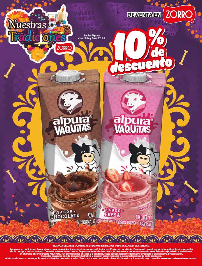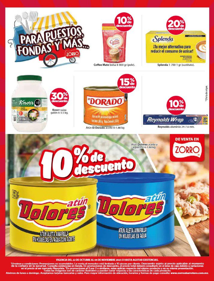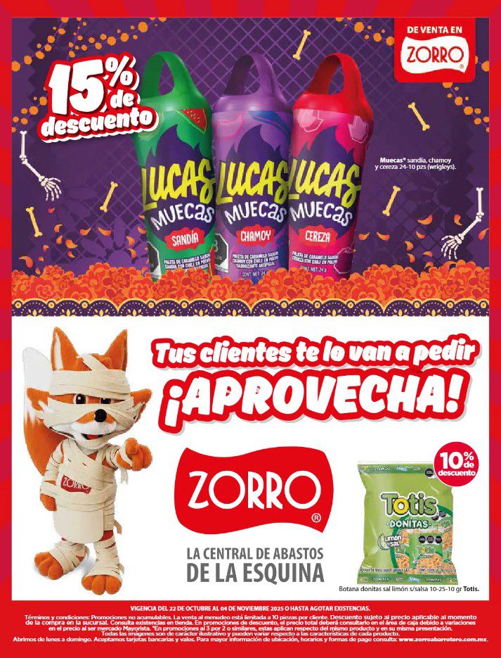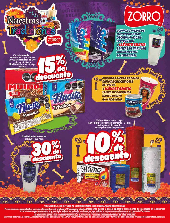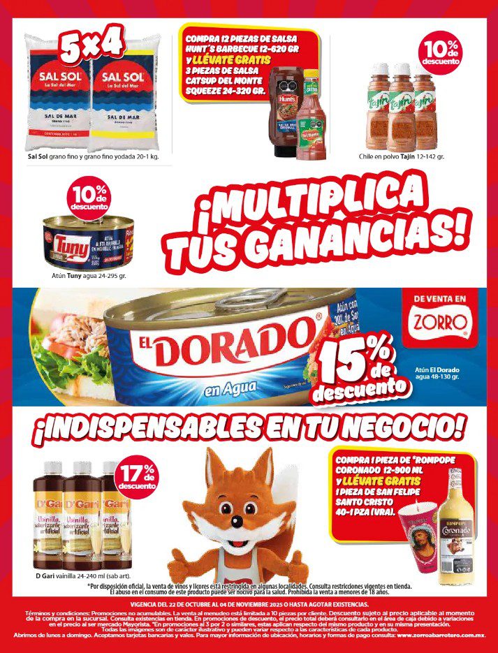 Apenas estoy viendo el folleto Nuestras Tradiciones, que el Zorro Abarrotero publicó y que contiene sus ofertas que estarán disponibles del 22 de octubre al 04 de noviembre de 2025, entre las que se encuentran 5×4, Al Tú por Tú, Marcas Exclusivas, Indispensables para tu Negocio, Producto Gratis en la compra de mercancía seleccionada, hasta un 30% de descuento y Precios especiales; las ofertas aplican en mercancía seleccionada. No es acumulable con otras promociones y aquí les dejo el folleto completo: