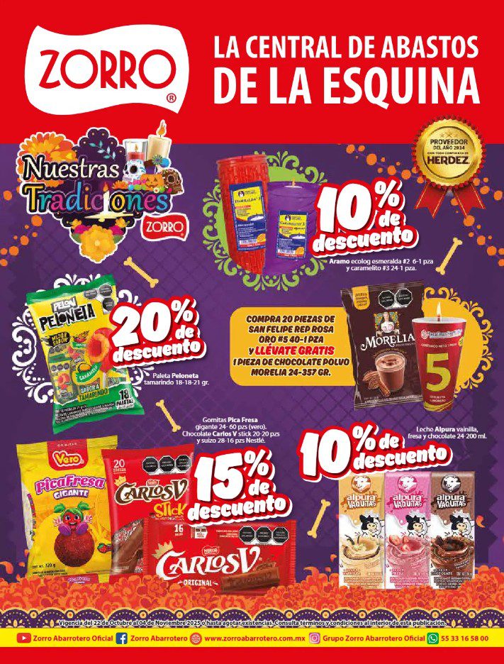 Apenas estoy viendo el folleto Nuestras Tradiciones, que el Zorro Abarrotero publicó y que contiene sus ofertas que estarán disponibles del 22 de octubre al 04 de noviembre de 2025, entre las que se encuentran 5×4, Al Tú por Tú, Marcas Exclusivas, Indispensables para tu Negocio, Producto Gratis en la compra de mercancía seleccionada, hasta un 30% de descuento y Precios especiales; las ofertas aplican en mercancía seleccionada. No es acumulable con otras promociones y aquí les dejo el folleto completo: