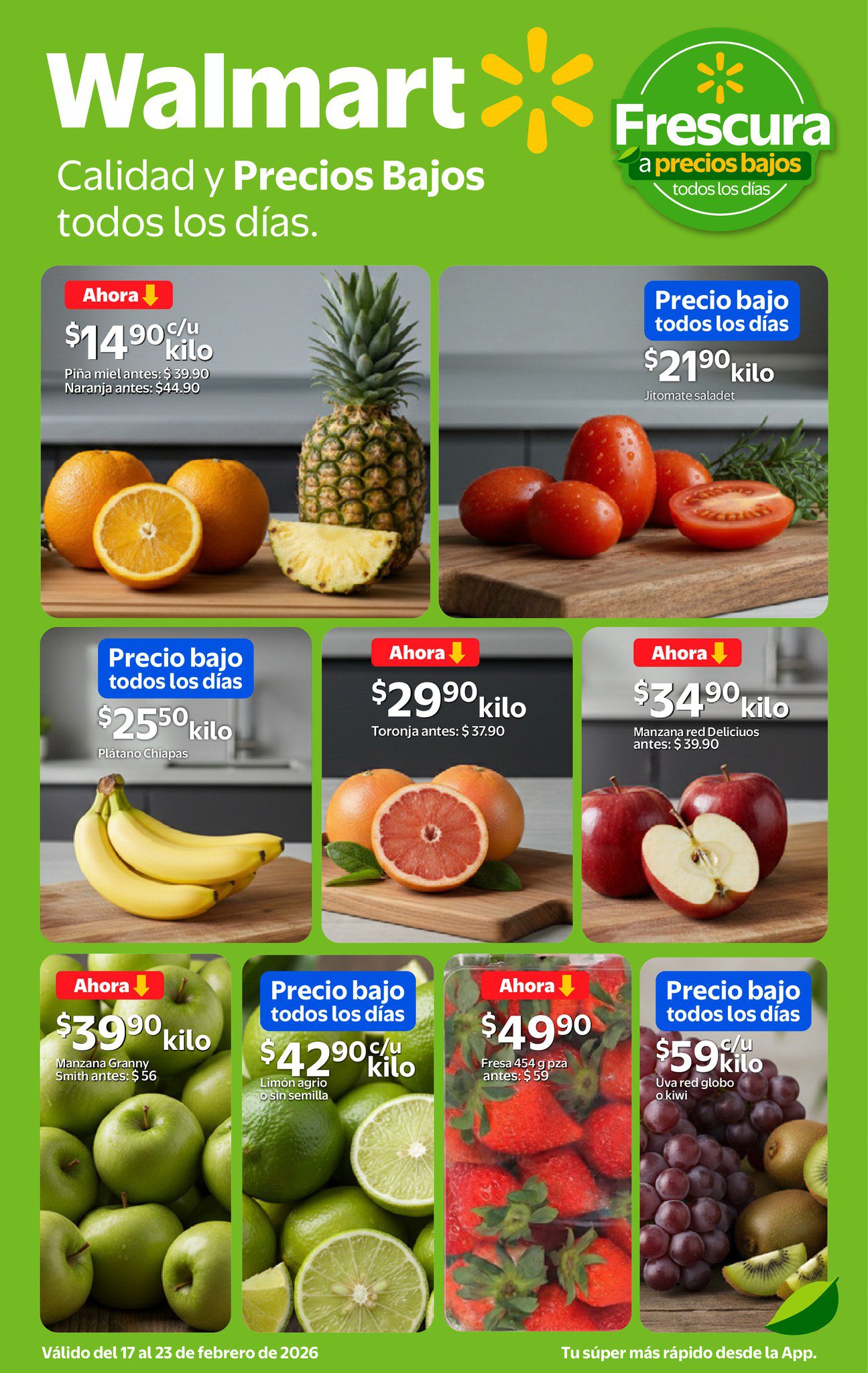 El Martes de Frescura Walmart presenta las ofertas de frutas y verduras para el día de mañana 17 de febrero de 2026 con precios válidos para tiendas participantes Walmart y también Walmart Express.