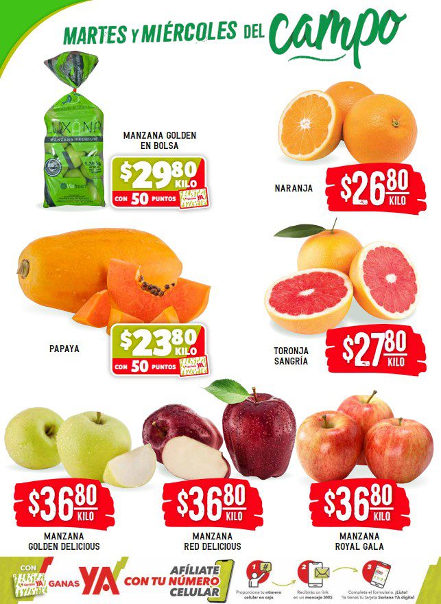 - Manzana Golden en bolsa a $29.80 el kilo con 50 Puntos Soriana Ya.