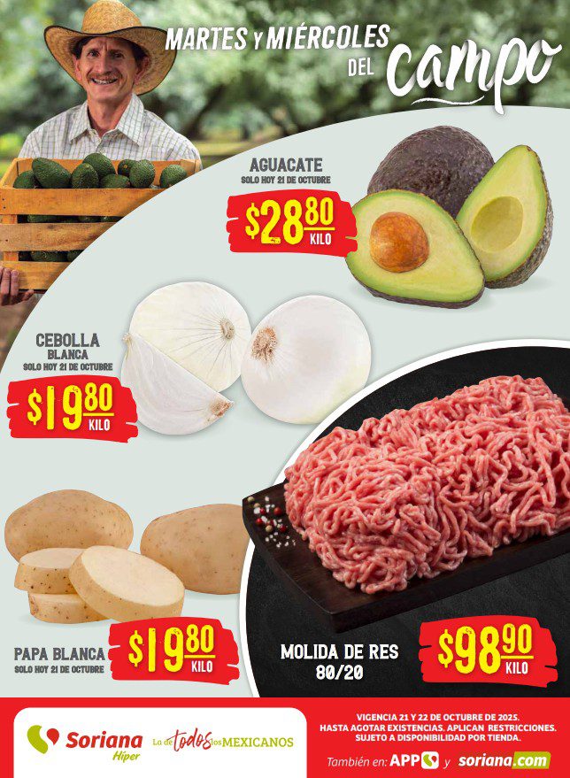 El Martes y Miércoles del Campo de Soriana tendrá preparadas las siguientes ofertas de frutas y verduras para este 21 y 22 de octubre de 2025 en sucursales Soriana participantes de la república mexicana.