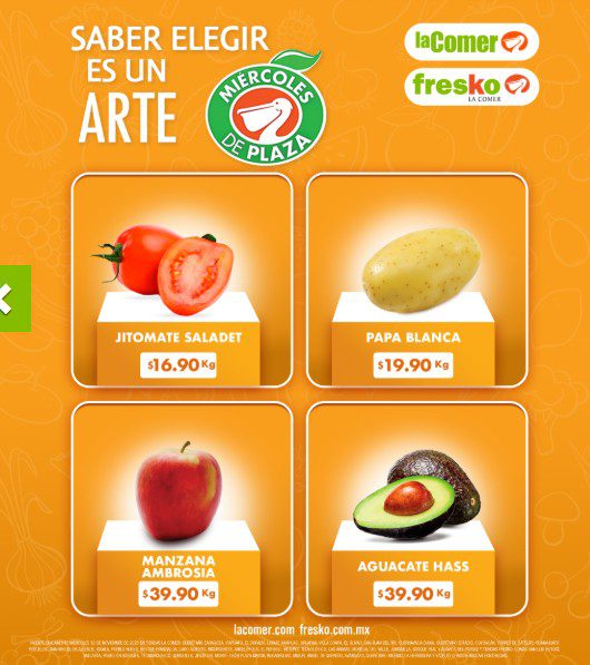 Estos son los precios de frutas y verduras que podrás encontrar el Miércoles de Plaza del 12 de noviembre 2025 en tiendas La Comer y Fresko y en su página de Internet www.lacomer.com.mx.