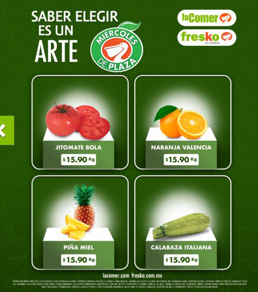 Estos son los precios de frutas y verduras que podrás encontrar el Miércoles de Plaza del 25 de febrero 2026 en tiendas La Comer y Fresko y en su página de Internet www.lacomer.com.mx.