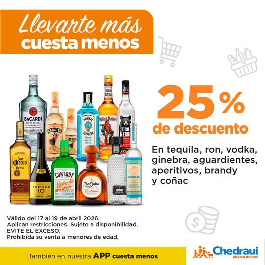 - 25% de descuento en Tequila, Ron, Vodka, Ginebra, Aguardientes, Aperitivos, Brandy y Cognac