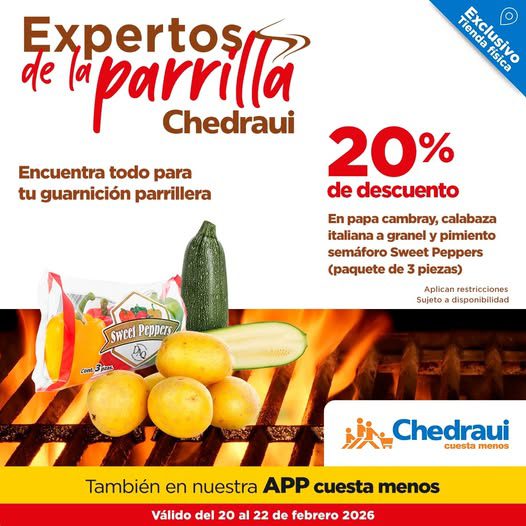 Desde el viernes 20 y hasta el lunes 23 de febrero de 2026, en las tiendas de autoservicio Chedraui, estarán sus promociones Llevarte más cuesta Menos, La Cuaresma más Fresca y Expertos de la Parrilla, con la que encontrarás hasta un 20% de descuento, hasta un 20% de Bonificación en monedero MiChedraui y Precios especiales; la promoción aplica en productos seleccionados y es válida en su tienda en línea www.chedraui.com.mx y en sus sucursales físicas.