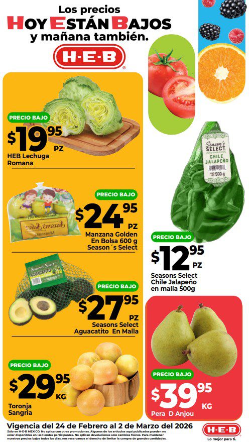 Ofertas HEB Precios bajos en frutas y verduras del 24 de febrero al 2 de marzo 2026