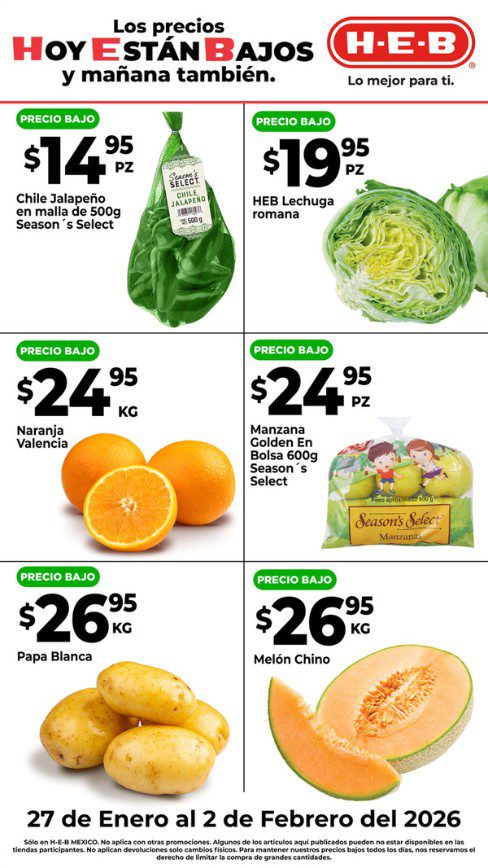 Estoy viendo el folleto “7 Días de Precios Bajos” con las ofertas que HEB está ofreciendo del 27 de enero al 02 d febrero de 2026 o agotar existencias: