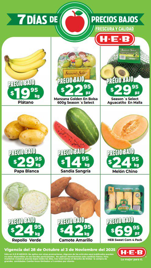 Estoy viendo el folleto “7 Días de Precios Bajos” con las ofertas que HEB está ofreciendo del 28 de octubre al 03 de noviembre de 2025 o agotar existencias: