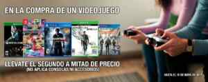 – Segundo a mitad de precio en todos los videojuegos (no aplica en consolas ni accesorios). Aplica en juegos de PS4, Xbox One y Nintendo Switch.