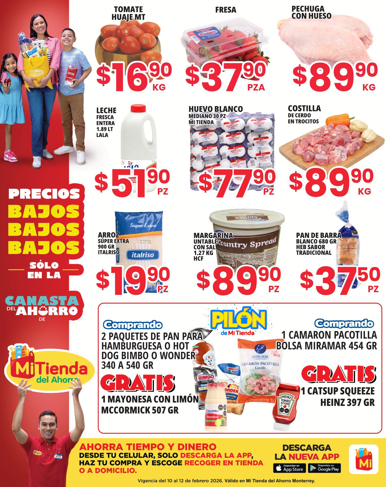 Acabo de ver el folleto Precios Bajos, solo en la Canasta del Ahorro, que Mi Tienda del Ahorro publicó, con sus ofertas en Frutas, Verduras y Carnes que están disponibles del 10 al 12 de febrero de 2026 o hasta agotar existencias, puedes realizar tus compras en su tienda en línea mitienda.mx:
