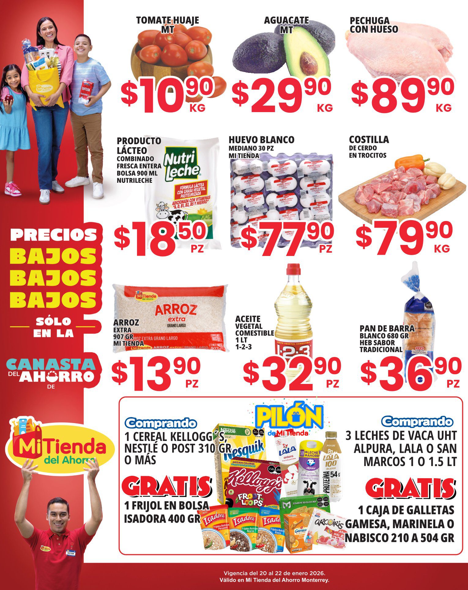 Acabo de ver el folleto Precios Bajos, solo en la Canasta del Ahorro, que Mi Tienda del Ahorro publicó, con sus ofertas en Frutas, Verduras y Carnes que están disponibles del 20 al 22 de enero de 2026 o hasta agotar existencias, puedes realizar tus compras en su tienda en línea mitienda.mx: