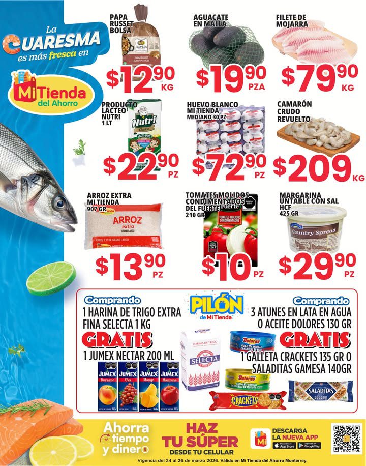 Acabo de ver el folleto La Cuaresma más fresca, que Mi Tienda del Ahorro publicó, con sus ofertas en Frutas, Verduras y Carnes que están disponibles del 24 al 26 de marzo de 2026 o hasta agotar existencias, puedes realizar tus compras en su tienda en línea mitienda.mx: