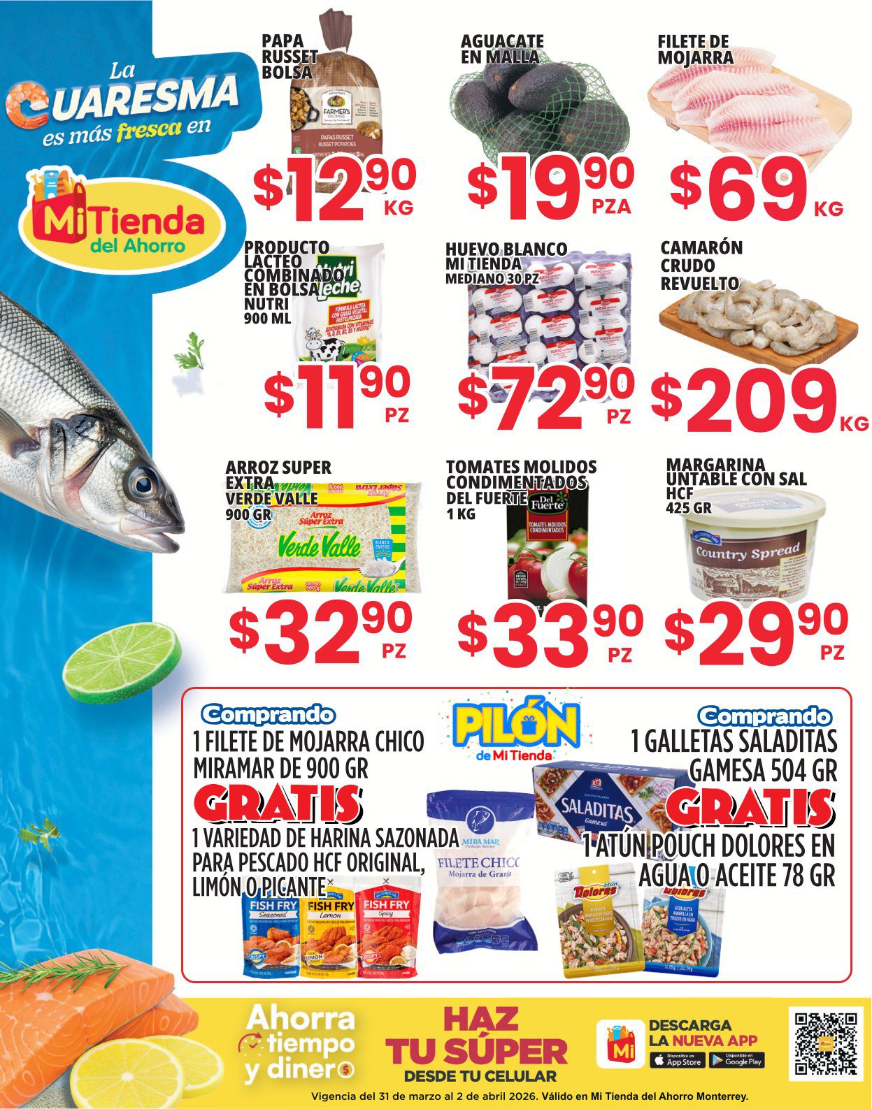 Acabo de ver el folleto La Cuaresma más fresca, que Mi Tienda del Ahorro publicó, con sus ofertas en Frutas, Verduras y Carnes que están disponibles del 31 de marzo al 02 de abril de 2026 o hasta agotar existencias, puedes realizar tus compras en su tienda en línea mitienda.mx: