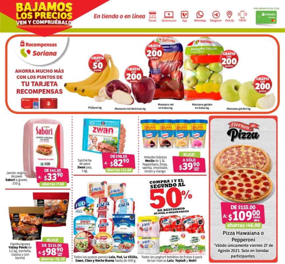 - Pizza familiar de Pepperoni o Hawaiana a $109.00 c/u (solo viernes 27 en tiendas participantes)