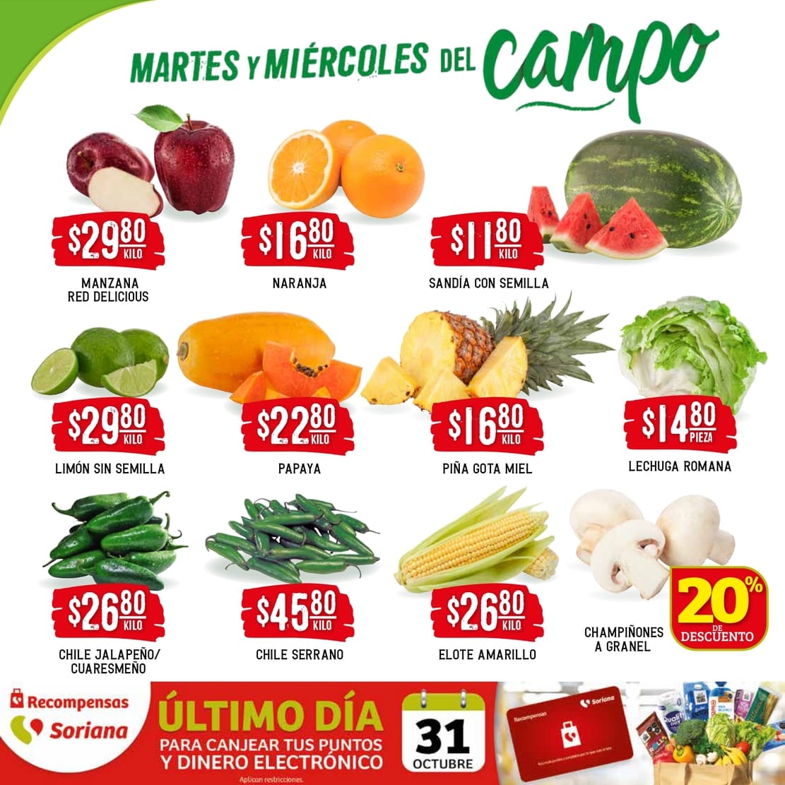 Por su parte el Martes y Miércoles del Campo de Soriana tendrá preparadas las siguientes ofertas de frutas y verduras para este 17 y 18 de octubre de 2023: