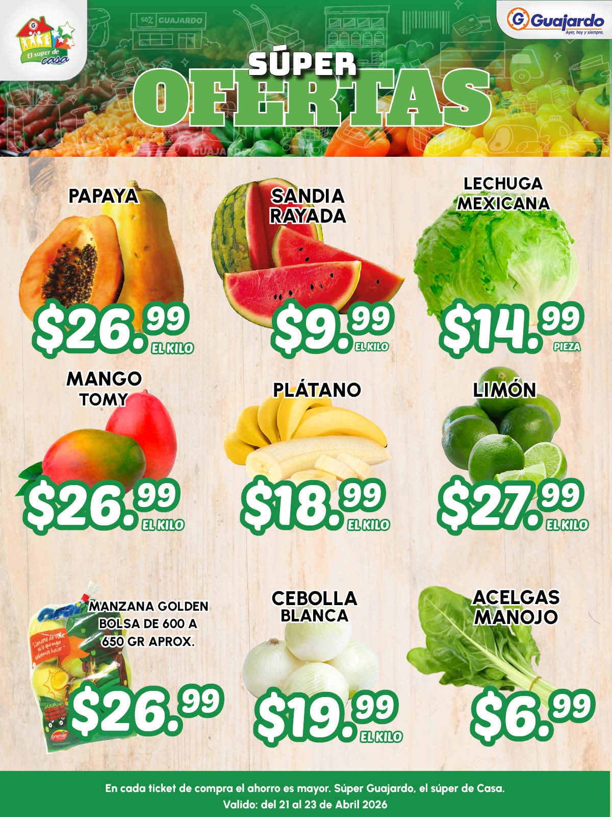 Te comparto el folleto Súper Ofertas con las ofertas de Frutas, Verduras y Carnes que Súper Guajardo tendrá disponibles del 21 al 23 de abril de 2026 y son estas: