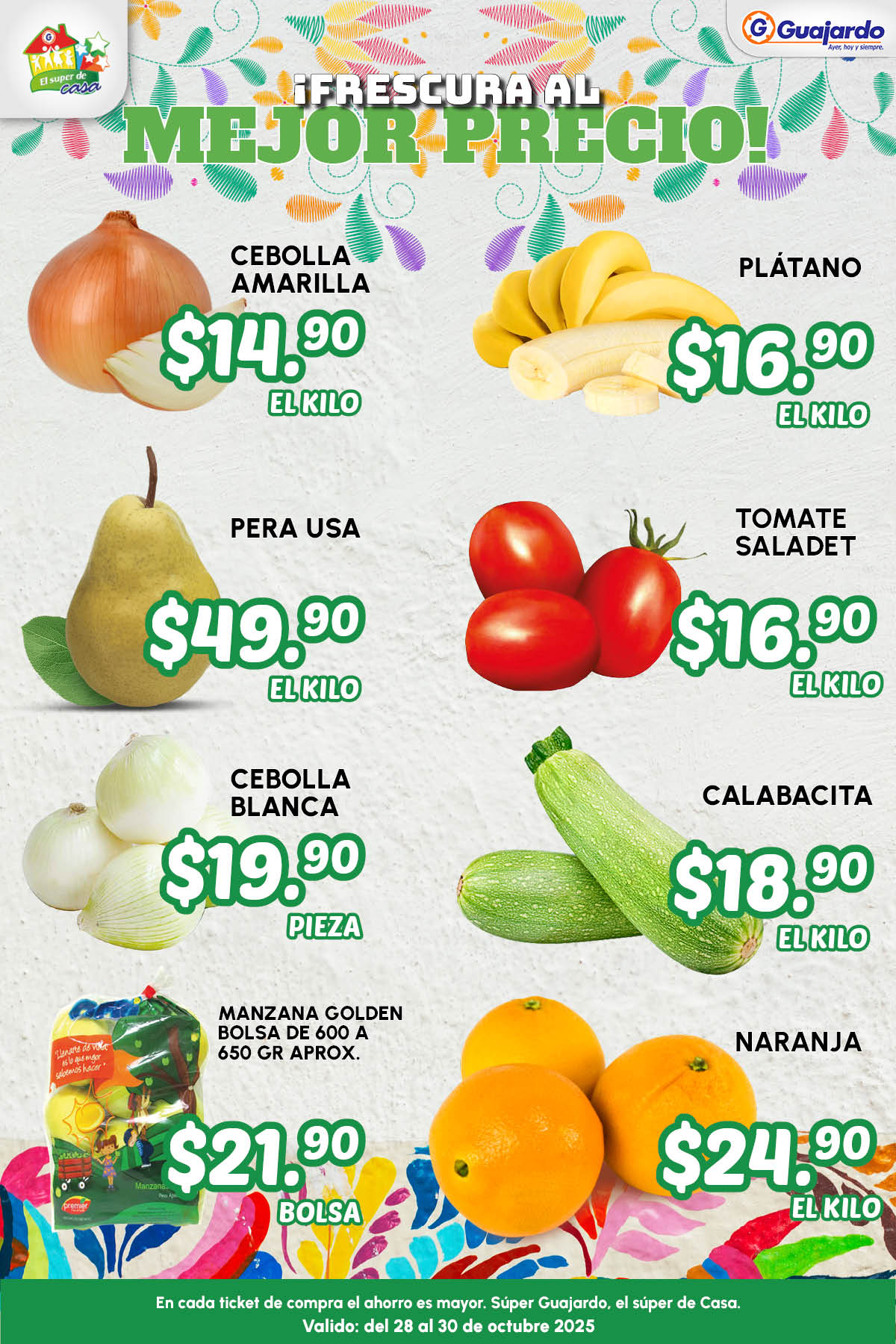 Te comparto el folleto Súper Ofertas con las ofertas de Frutas, Verduras y Carnes que Súper Guajardo tendrá disponibles del 28 al 30 de octubre de 2025 y son estas: