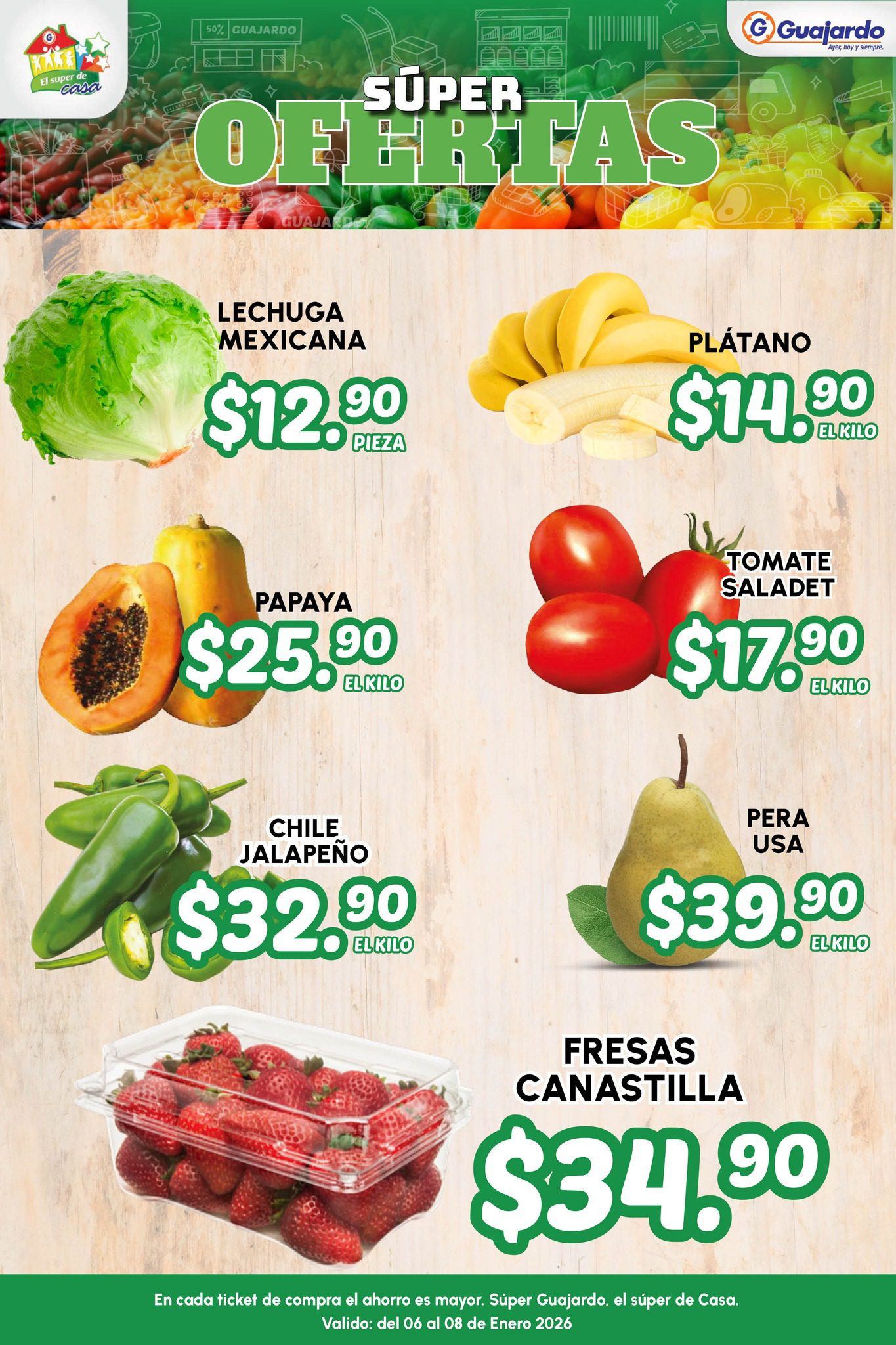 Te comparto el folleto Súper Ofertas con las ofertas de Frutas, Verduras y Carnes que Súper Guajardo tendrá disponibles del 06 al 08 de enero de 2026 y son estas:
