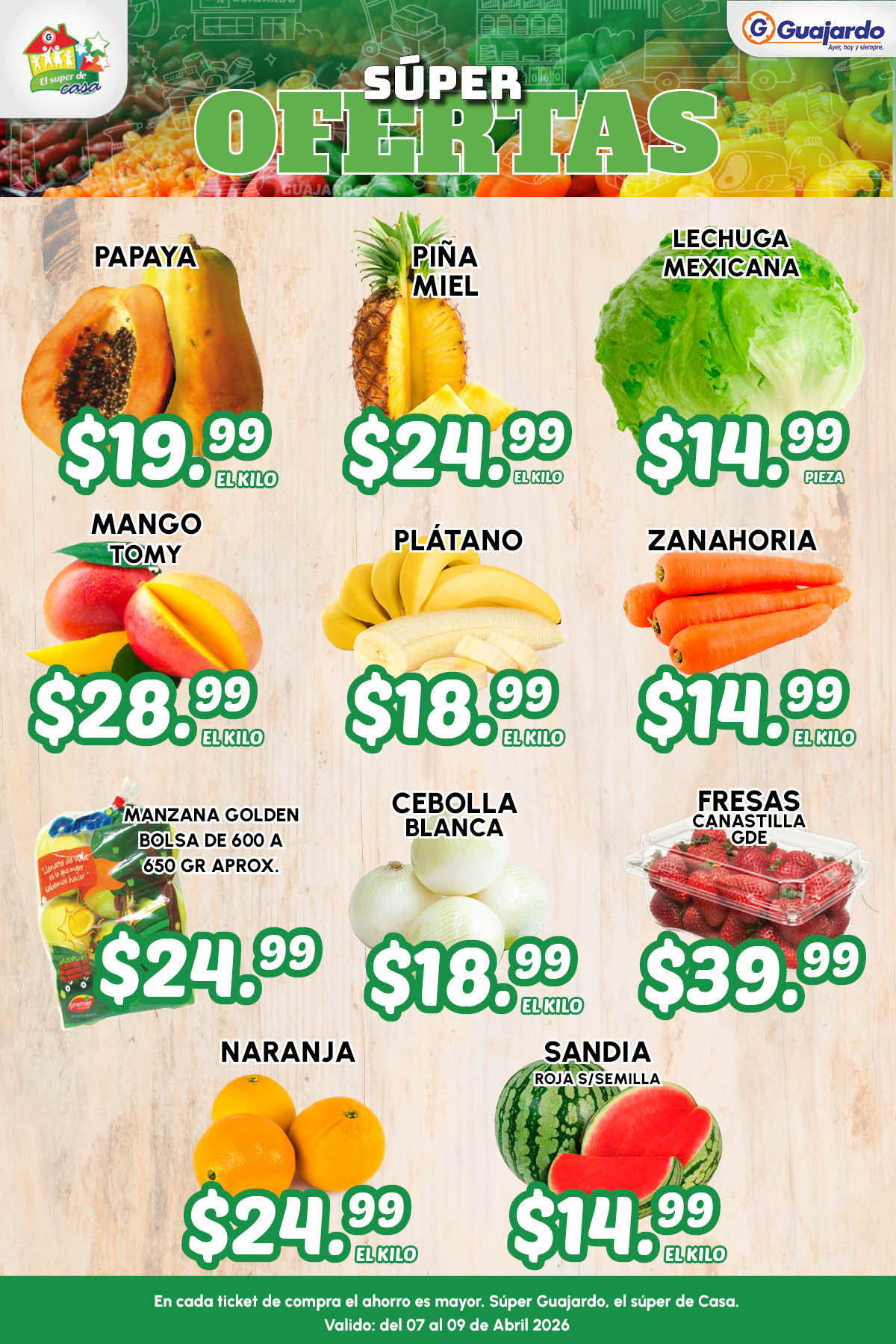 Te comparto el folleto Súper Ofertas con las ofertas de Frutas, Verduras y Carnes que Súper Guajardo tendrá disponibles del 07 al 09 de abril de 2026 y son estas: