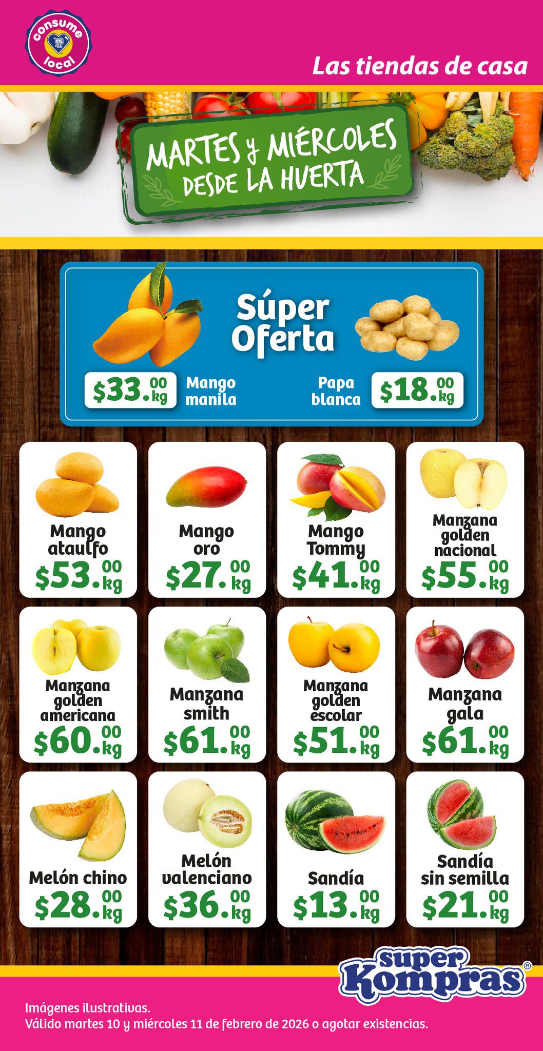 Sólo por hoy y mañana (martes 10 y miércoles 11 de febrero de 2026) o hasta agotar existencias, estarán disponibles las ofertas de Frutas y Verduras del folleto “Martes y Miércoles desde la Huerta” que Super Kompras está ofreciendo: