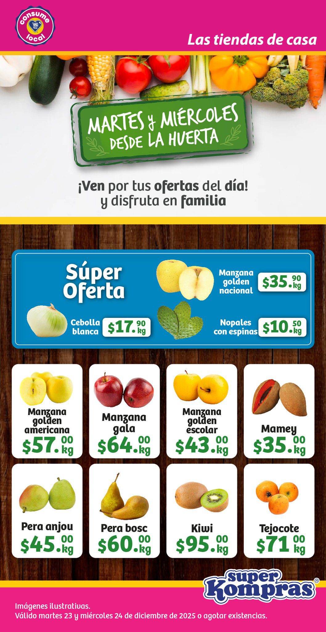 Sólo por hoy y mañana (martes 23 y miércoles 24 de diciembre de 2025) o hasta agotar existencias, estarán disponibles las ofertas de Frutas y Verduras del folleto “Martes y Miércoles desde la Huerta” que Super Kompras está ofreciendo: