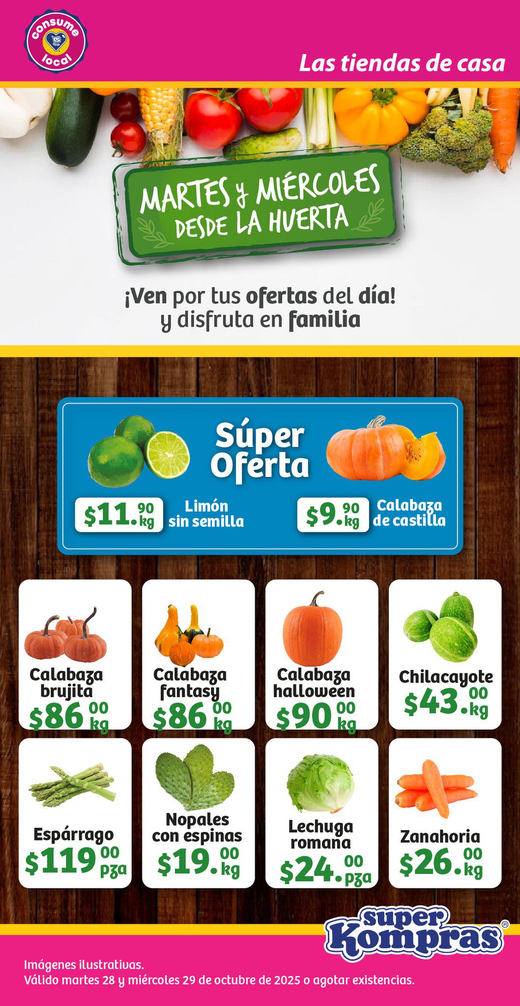 Sólo por hoy y mañana (martes 28 y miércoles 29 de octubre de 2025) o hasta agotar existencias, estarán disponibles las ofertas de Frutas y Verduras del folleto “Martes y Miércoles desde la Huerta” que Super Kompras está ofreciendo: