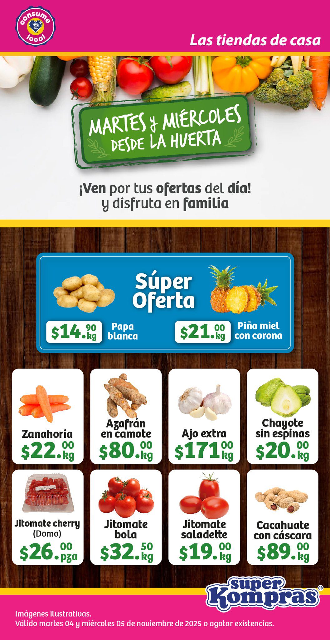 Sólo por hoy y mañana (martes 04 y miércoles 05 de noviembre de 2025) o hasta agotar existencias, estarán disponibles las ofertas de Frutas y Verduras del folleto “Martes y Miércoles desde la Huerta” que Super Kompras está ofreciendo: