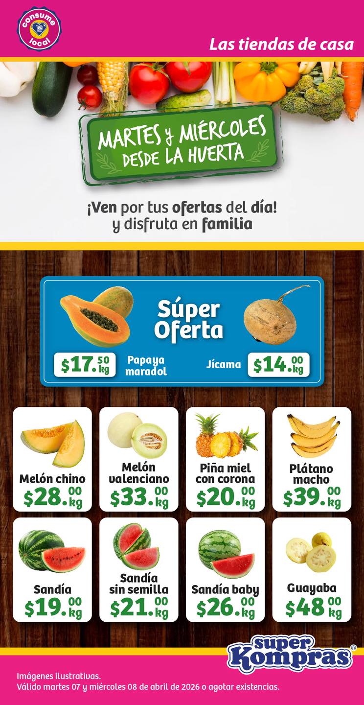 Sólo por hoy y mañana (martes 07 y miércoles 08 de abril de 2026) o hasta agotar existencias, estarán disponibles las ofertas de Frutas y Verduras del folleto “Martes y Miércoles desde la Huerta” que Super Kompras está ofreciendo: