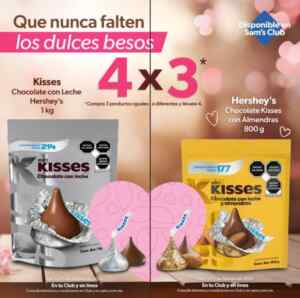 Hace unos minutos me percaté que en los clubes de precios Sam’s Club, está su promoción Que Nunca falten Dulces Besos por San Valentín, en la que te ofrecen un 4×3 en chocolates Kisses seleccionados: Kisses Chocolate con leche Hershey’s de 1 Kg y Hershey’s Chocolate Kisses con almendras de 800 g (compras 3 productos iguales o diferentes y te llevarás GRATIS el 4º de igual o menor precio); la promoción aplica en productos participantes, es válida en su tienda en línea www.sams.com.mx, en su App (que puedes descargar en este enlace: sams.com.mx/segment/scan-and-go) y en sus clubes físicos y cuenta con una vigencia del 03 al 15 de febrero de 2026.