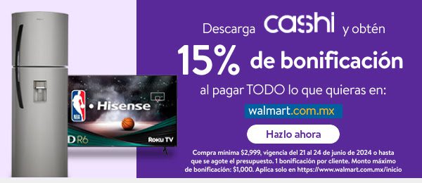 - 15% de Bonificación en todos los productos si pagas con Cashi; la promoción aplica en compras por un mínimo de $2,999.00, estará vigente del 21 a 24 de junio de 2024 o hasta que se agote el presupuesto. Está limitado a 1 bonificación por cliente y el monto máximo de bonificación es de $1,000.00 por cliente