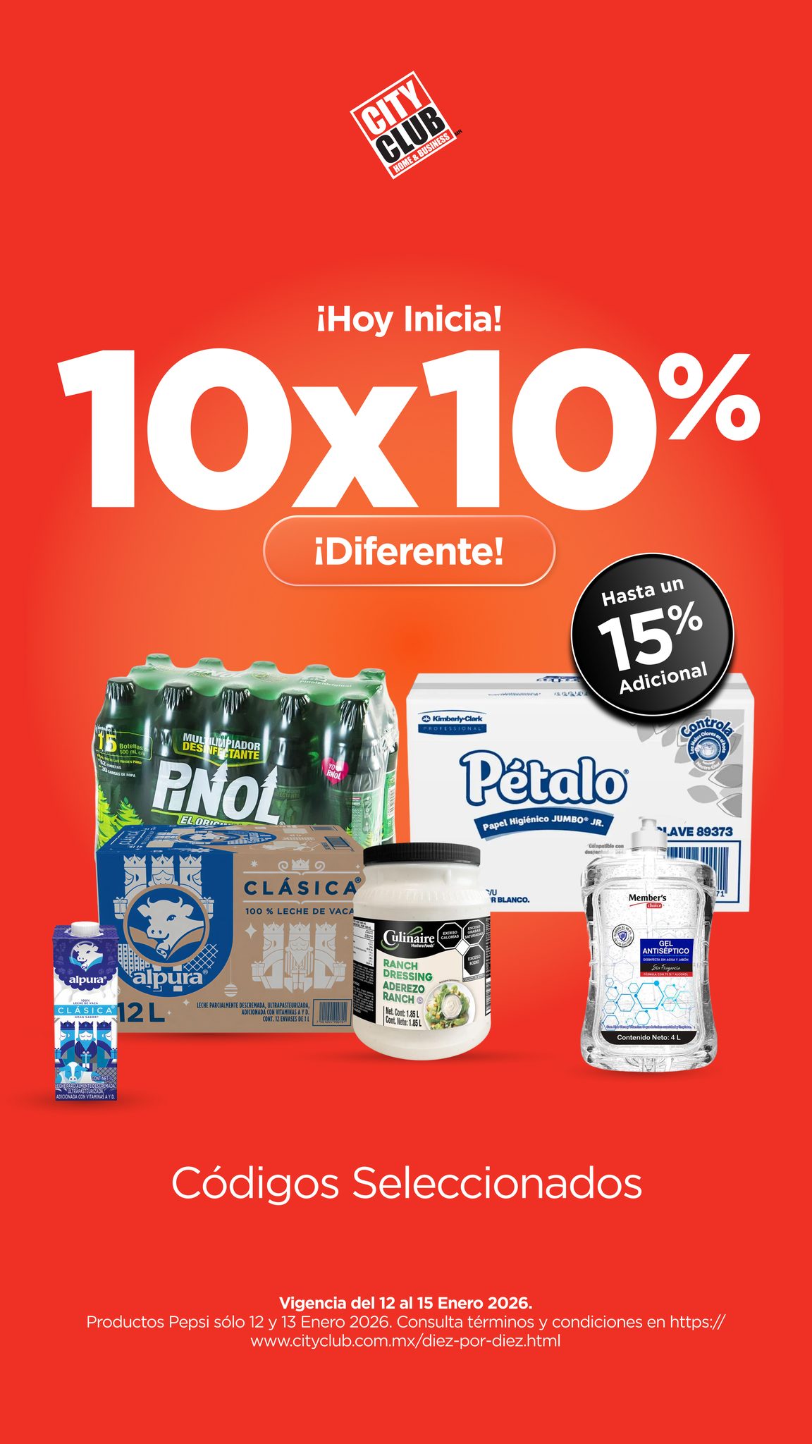 A partir del lunes 12 y hasta el jueves 15 de enero de 2026, en los clubes de precios City Club, estará su promoción 10×10, en la que te darán un 10% de descuento en la compra de 10 productos seleccionados e identificados con la etiqueta 10×10 (y los puedes combinar como tú quieras de 10 en 10) + hasta un 15% de descuento adicional (los descuentos son acumulables); la promoción aplica en códigos seleccionados de Despensa y Abarrotes, es válida en su tienda en línea www.cityclub.com.mx/ y en sus clubes físicos.