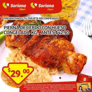 Les comparto la oferta del día en Soriana para hoy 9 de enero de 2016: Pierna de cerdo con hueso congelada rebajada de $42.90 a sólo $29 pesos el kilo. La promoción es válida con tarjeta de lealtad (se las dan en servicio a clientes si aún no la tienen). Limitado a 3 kg por cliente.