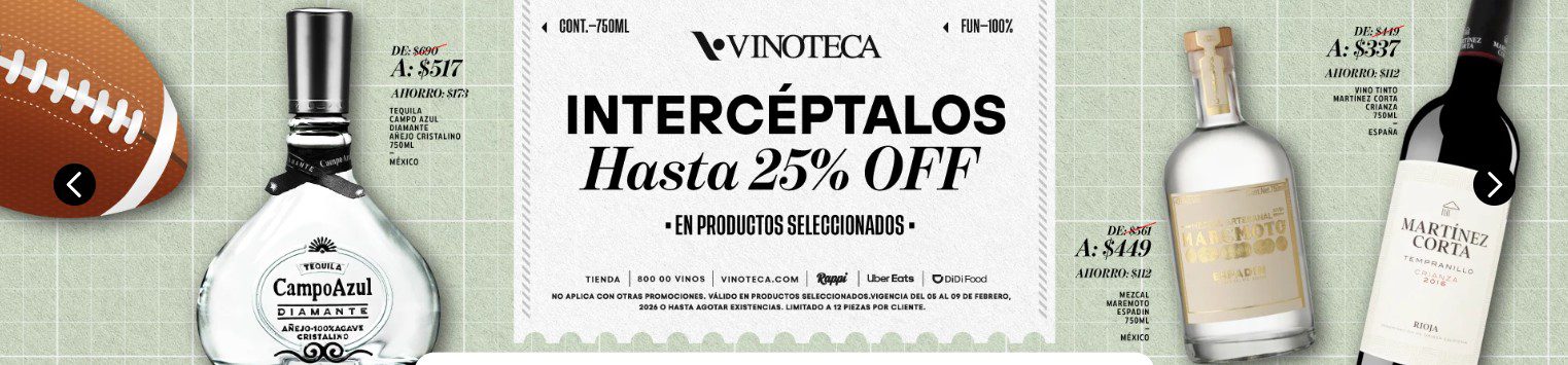 Ya inició la promoción por el Super Bowl en Vinoteca, con la que te ofrecen hasta un 25% de descuento; la promoción aplica en productos seleccionados, es válida en sus sucursales físicas, en su página de Internet www.vinoteca.com, vía telefónica al 800 00 VINOS, al *4500 y a través de Rappi, DiDi Food y Uber Eats y tiene una vigencia del 05 al 09 de febrero de 2026 o hasta agotar existencias.