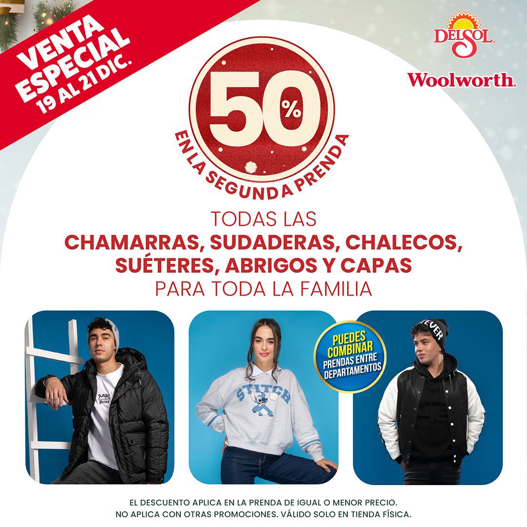 Les comparto la Venta Especial de navidad de las tiendas departamentales Del Sol y Woolworth, con la que les están ofreciendo un 50% de descuento en la Segunda prenda, y hasta un 50% de descuento; la promoción aplica en artículos participantes, es válida en sus sucursales físicas, en su tienda en línea delsol.com.mx y solo estará vigente del 19 al 25 de diciembre de 2025.