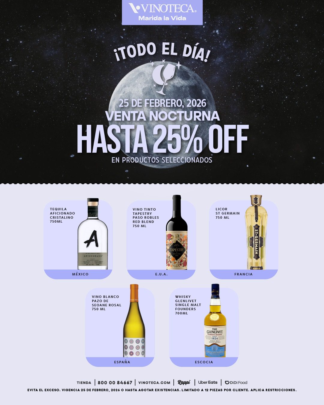 El día de hoy miércoles 25 de febrero de 2026 o hasta agotar existencias, en Vinoteca estará su Venta Nocturna, en la que encontrarás hasta un 25% de descuento en Vinos y Licores seleccionados; la promoción es válida durante todo el día en sus sucursales físicas, en su página de Internet www.vinoteca.com, vía telefónica al 800 00 84667, al *4500 y a través de Rappi, Uber Eats y DiDi Food.