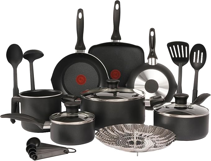 T-fal Batería de Cocina Easy Care de 20 piezas color Negra con Antiadherente Titanium, tecnología Thermo Señal, de…