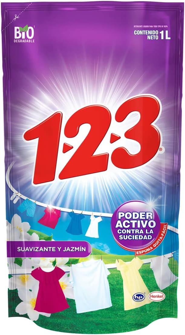1-2-3 - Detergente Líquido, 1L; MAXI PODER Suavizante y Jazmín, Contra la Suciedad, Espuma Quitamanchas.