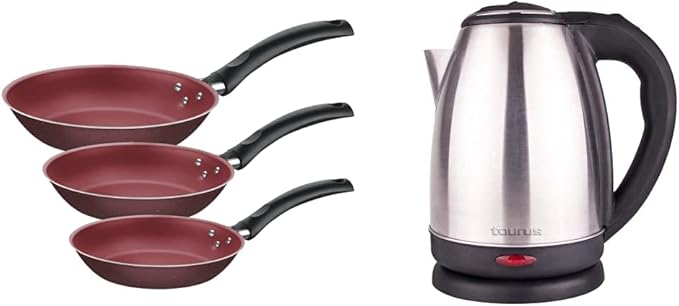 Tramontina Juego de Sartenes Turim, Rojo + Taurus Hervidor de Agua Caronte, 2 Lt, 1000 W, Chico, Plata