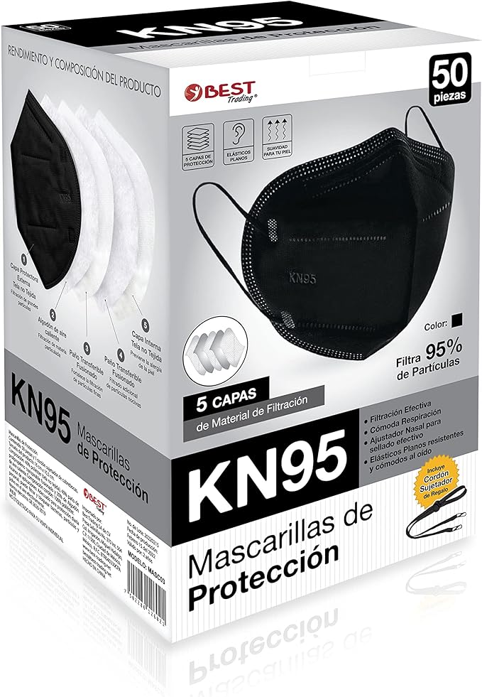 Best Trading 50 Cubrebocas KN95 Negro, Tapabocas de 5 Capas contra Partículas, Mascarilla Desechable (50 Piezas)