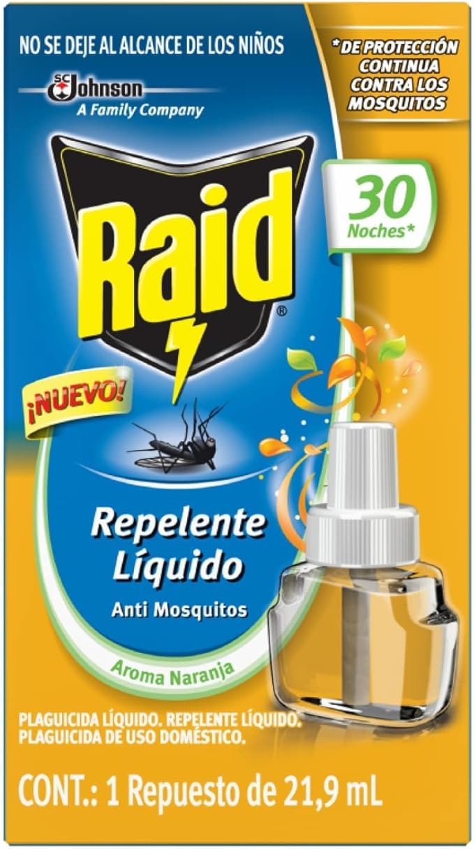 Raid Repelente Líquido, Repuesto 30 Noches, Aroma Naranja, 21.9mL