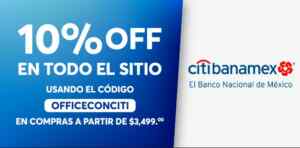A partir del 20 y hasta el 26 de abril de 2024, con su promoción del Mes, en Office Depot podrás obtener un 10% de descuento adicional a lo Ya Rebajado en todo el sitio y sin límite de redención de usuarios; la promoción aplica en compras por superiores a $3,499.00 si pagas con tu tarjeta Citibanamex, es válida en su tienda en línea officedepot.com.mx en la que debes usar el código de descuento OFFICECONCITI.