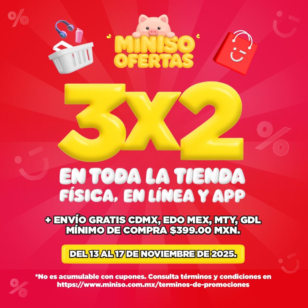 Estoy viendo que en las tiendas de mercancía para el hogar y de consumo Miniso, con su promoción Miniso Ofertas, te ofrecen un 3×2 en toda la tienda (el producto Gratis será el de menor precio) + Envío Gratis (CDMX, Estado de México, Monterrey y Guadalajara), en compras a partir de $399.00; la promoción aplica en productos participantes, es válida en su tienda en línea www.miniso.com.mx, en su App (que puedes descargar desde ese mismo sitio) y en sus sucursales físicas (excepto en Aeropuertos) y estará vigente del 13 al 17 de noviembre de 2025 o hasta agotar existencias.