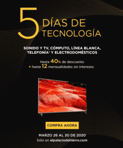 En las tiendas departamentales El Palacio de Hierro está su promoción «5 Días de Tecnología», en la que obtendrás hasta un 40% de descuento + hasta 12 meses sin intereses si pagas con tarjetas participantes, en Sonido y TV, Cómputo, Línea, blanca, Telefonía y Electrodomésticos, La promoción es válida únicamente en su tienda en línea elpalaciodehierro.com del 26 al 30 de marzo de 2020.