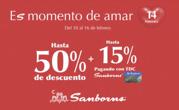 A partir del 10 y hasta el 16 de febrero de 2026, en las tiendas departamentales Sanborns estará su Venta Es Momento de Amar, por San Valentín, en la que encontrarás hasta un 50% de descuento + hasta un 15% de descuento adicional con tu tarjeta de crédito Sanborns; la promoción aplica en productos seleccionados, y es válida en su sitio web sanborns.com.mx y en todas sus sucursales físicas.