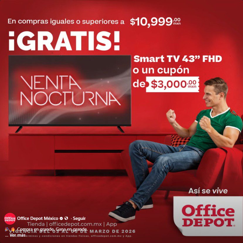 Del 03 al 05 de marzo de 2026 hasta agotar existencias, estará la Venta Nocturna de Office Depot, en la que en su página web www.officedepot.com.mx, en su App (que puedes descargar desde esa misma página) y en sus sucursales físicas, nos estarán dando GRATIS una Smart TV FHD de 43’’ ó 1 cupón de $3,000.00 en compras iguales o superiores a $10,999.00 (podrás escoger entre la Smart TV ó el Cupón), hasta un 40% de descuento; Precios especiales y hasta 18 Meses sin intereses con tarjetas participantes; las ofertas son válidas en productos seleccionados y algunas son las siguientes: