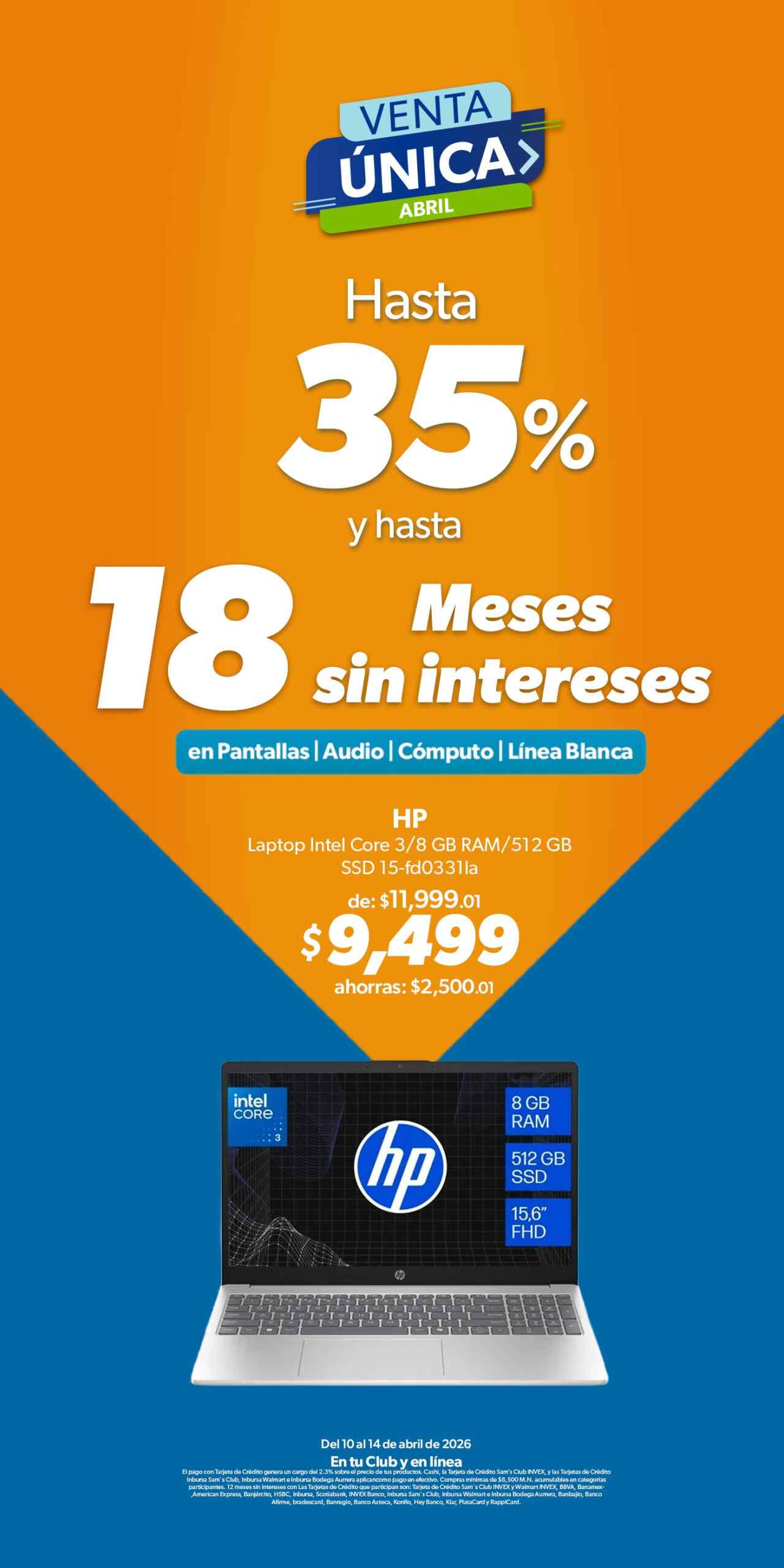 Les aviso que hasta mañana martes 14 de abril de 2026, en los clubes de precios Sam’s Club estará su Venta Única, con la que están ofreciendo hasta un 35% de descuento + hasta 18 meses sin intereses si pagas con tarjetas de crédito participantes; la promoción aplica en productos seleccionados de Pantallas, Audio, Cómputo y Línea blanca, es válida en su tienda en línea sams.com.mx y en sus Clubes físicos.